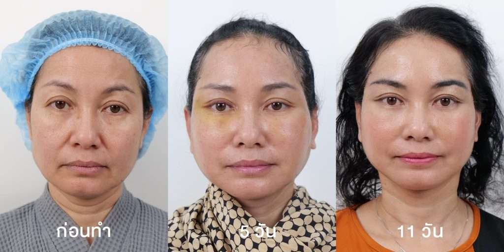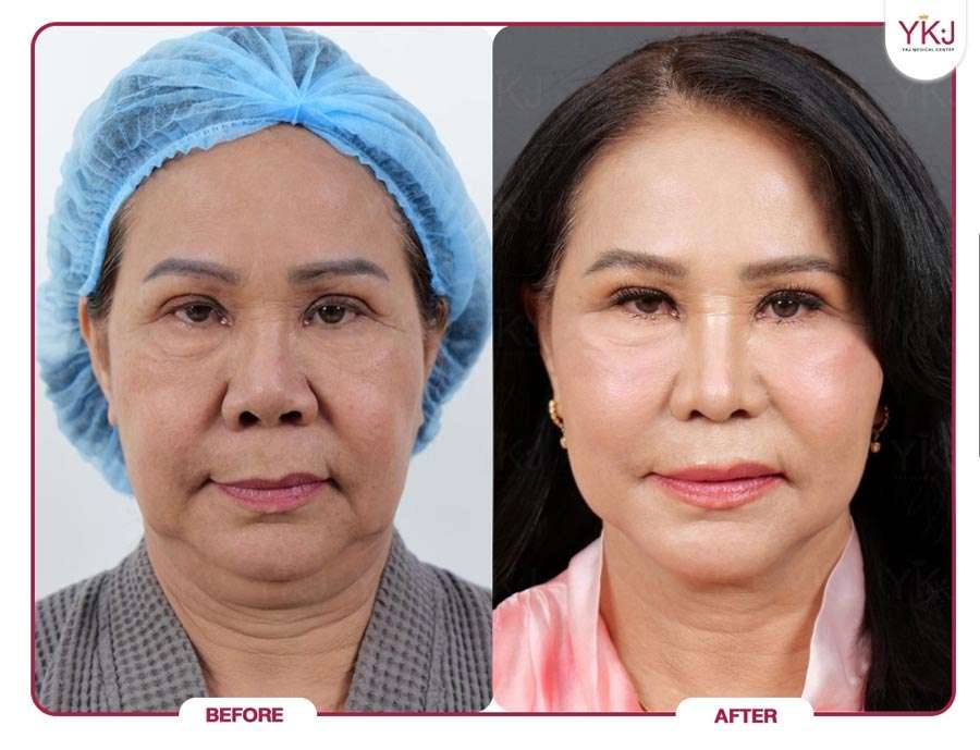 Ms. Kratai (Age 60) , She wanted to look younger like a teenager. Ms. Kratai had problems with sagging skin, droopy eyebrows, deep nasolabial folds, double chin, and loose neck. These problems were caused by aging. After one month, Ms. Kratai was impressed with her new look. Her face was slimmer and younger, and her wrinkled skin was tightened and firm. Her double chin and saggy cheeks were gone.