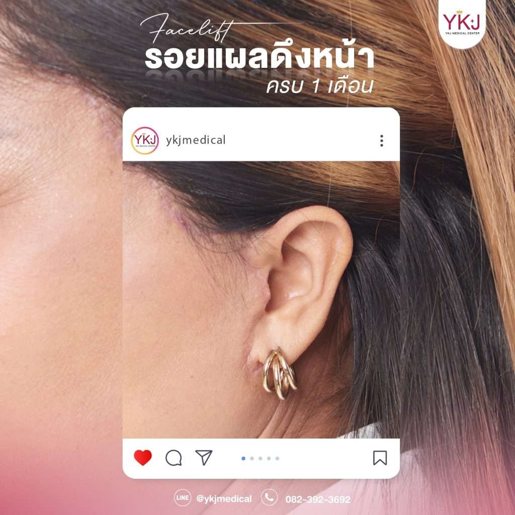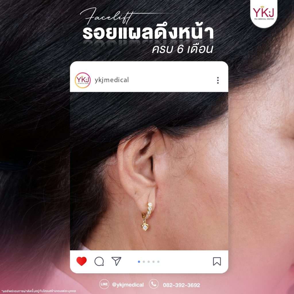Ms. Luknok Supaporn (Age 51), a famous Thai country music singer, underwent her first cosmetic surgery in her life. She underwent a facelift using the High SMASectomy technique at YKJ Medical Clinic one month ago, and with Scarless suture technique, she got a smooth and beautiful scar that healed quickly.
