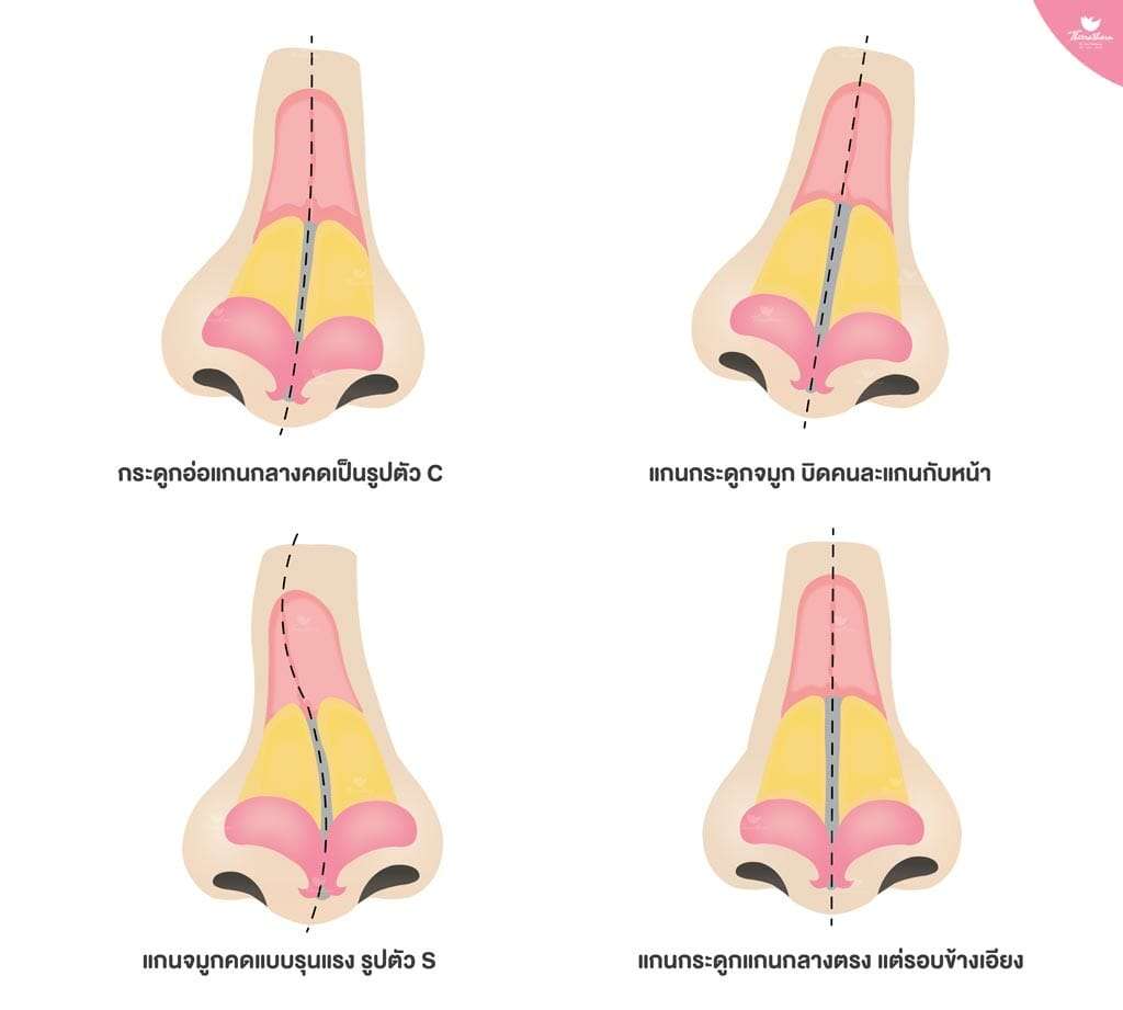 ลักษณะโครงสร้างจมูกคดเอียงในรูปแบบต่างๆ ได้แก่ แกนกลางคดเป็นรูปตัว S และแกนกลางตรงแต่รอบข้างเอียง