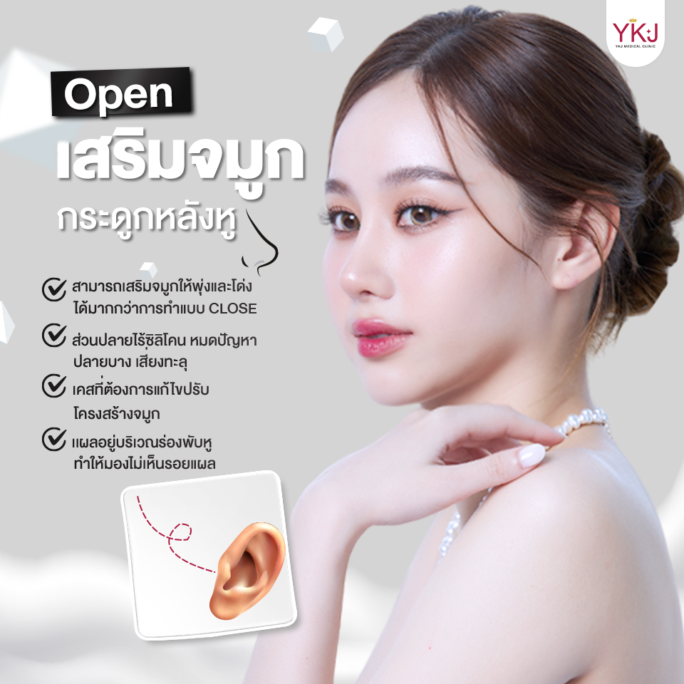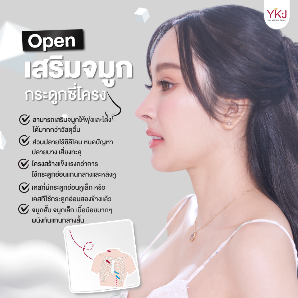 เสริมโอเพ่นสามารถทำได้ทั้งแบบใส่ซิลิโคนและไม่ใส่ซิลิโคน โดยส่วนใหญ่แพทย์ที่ YKJ Medical Clinic จะใส่ซิลิโคนเพียง 20-30% บริเวณสันจมูก หรือในบางเคสที่มีสันอยู่แล้วสามารถทำแบบไร้ซิลิโคน หรือสามารถทำโดยใส่กอร์เท็กซ์บริเวณสันได้เช่นกัน